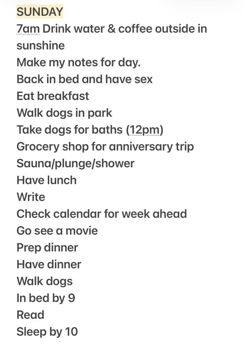 I write out my days in advance, especially weekends, with an emphasis on fun. Sometimes the highlight is the gym. Sometimes it’s sex. Sometimes it’s a great meal. Sometimes it’s getting my car washed while I sit nearby with a cappuccino.